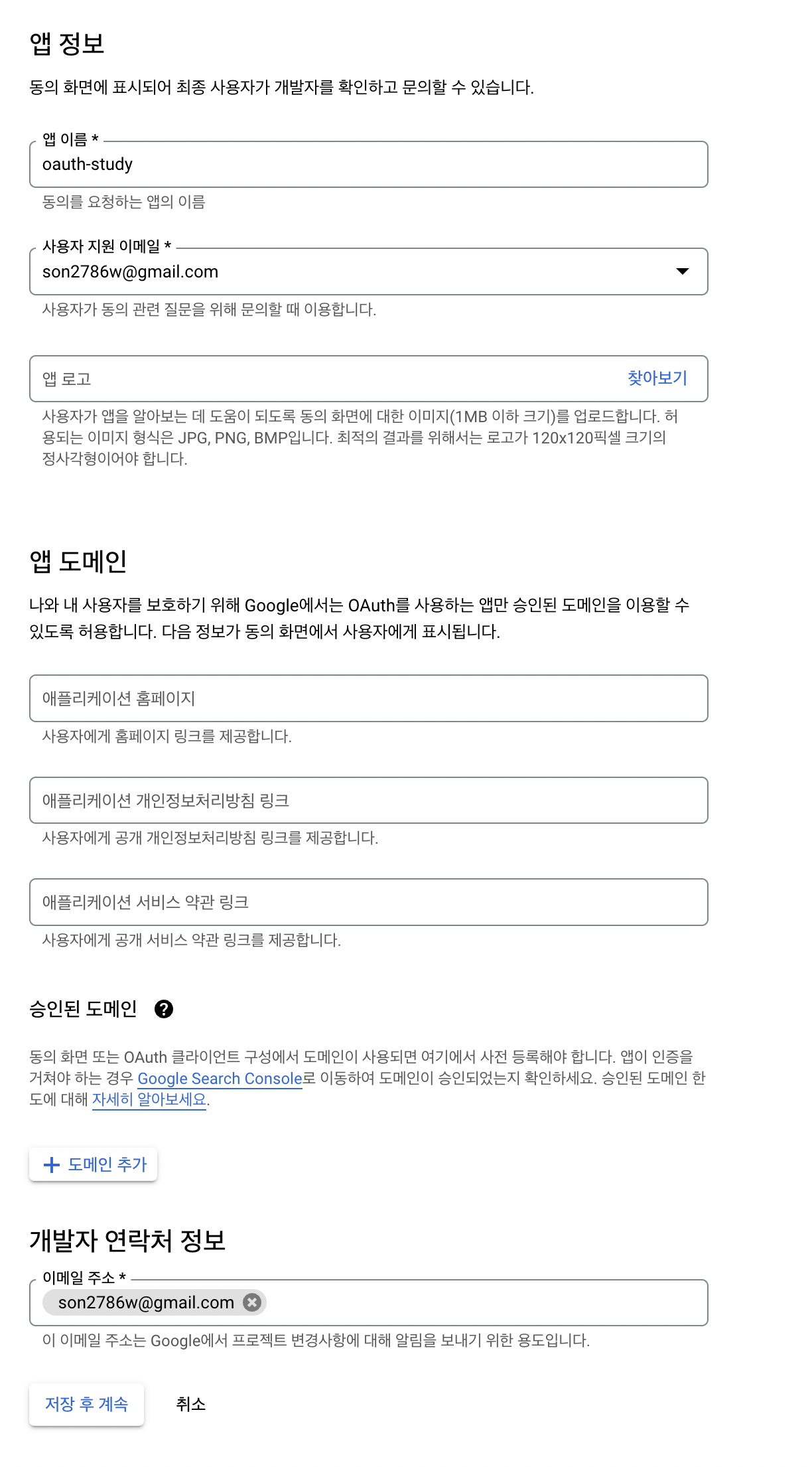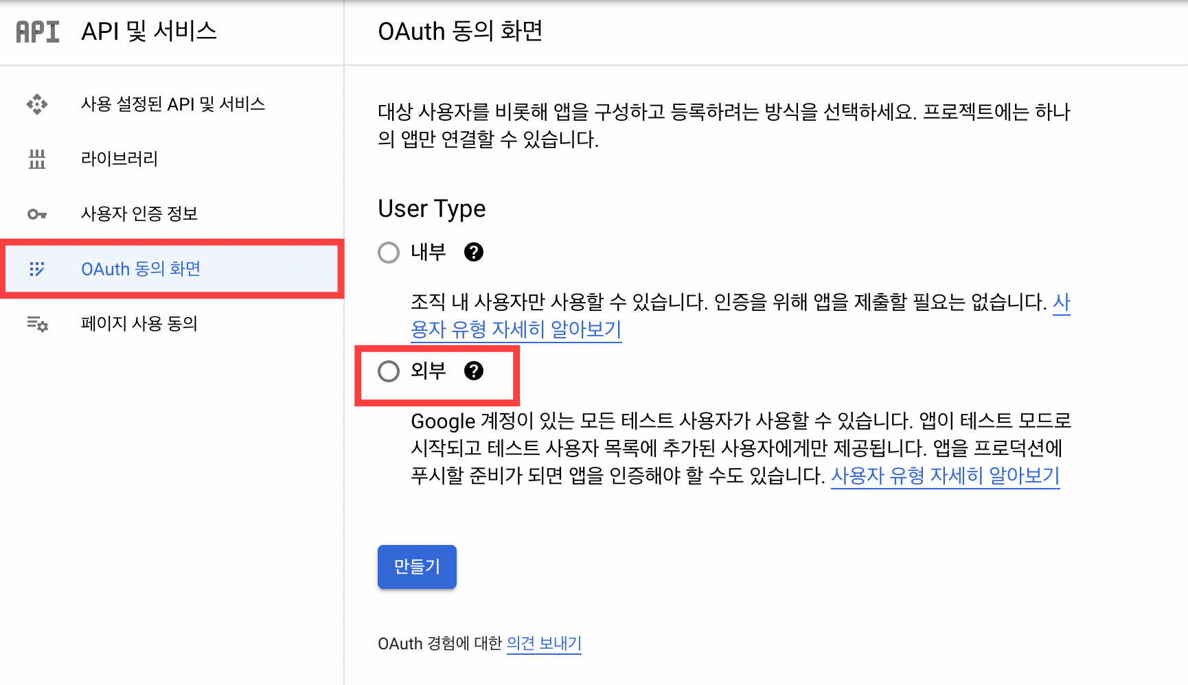 그리고 API 및 서비스를 선택해 OAuth 동의 화면으로 넘어가 아래 사진과 같이 입력합니다.
