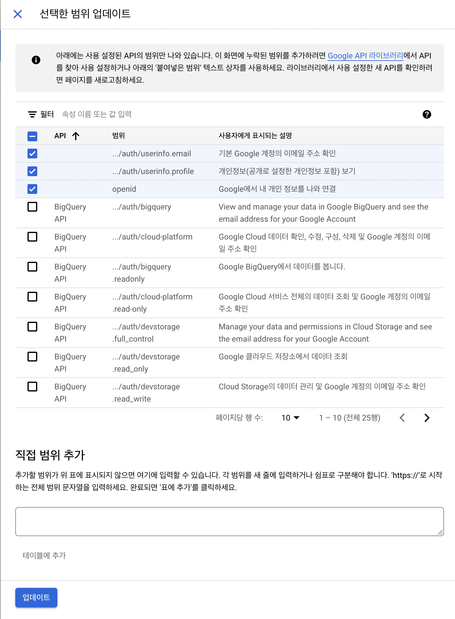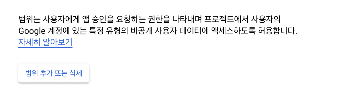 범위 추가 또는 삭제를 클릭해 어떤 데이터에 액세스할지 범위를 설정합니다.
